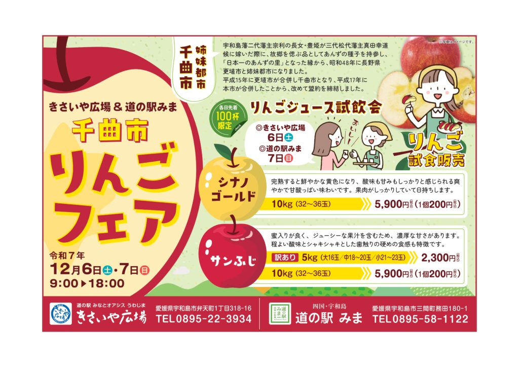 姉妹都市である長野県千曲市より旬の「シナノゴールド」「サンふじ」が道の駅みまにやってきます。フェア期間中は千曲市職員によるりんごの試食販売、蛇口からりんごジュース体験を行います。どれも数量限定となりますのでお早めにお買い求めください。