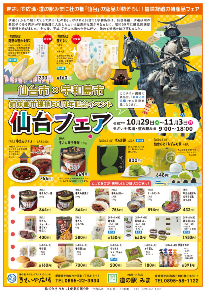 道の駅みまと道の駅きさいや広場にて仙台特産のずんだを使った商品や牛たん商品など販売いたします。