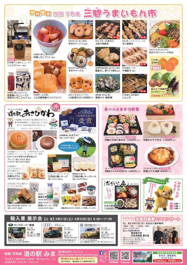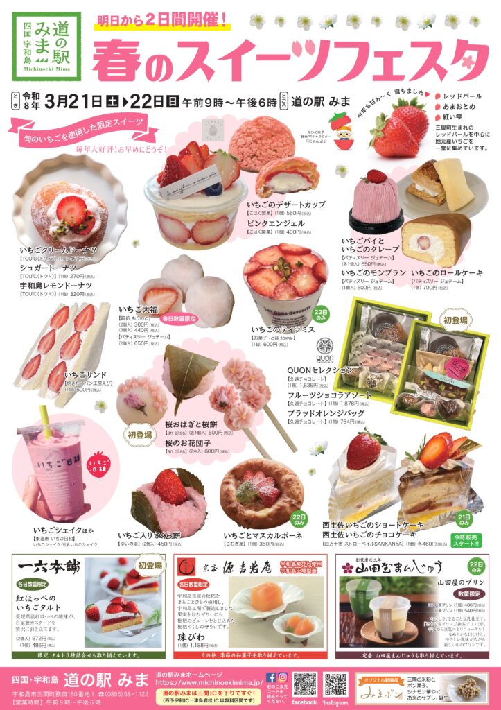 令和8年3月21日(土)~22日(日)に「道の駅みま 春のスイーツフェスタ」を開催します。